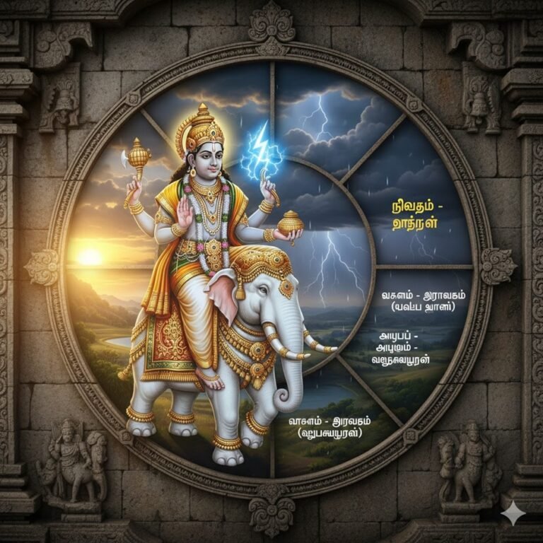 தலைப்பு விளக்கம்திசை கிழக்கு (East)திசைக் கடவுள் இந்திரன்வாகனம் ஐராவதம் (Airaavatham – வெள்ளை யானை)ஆயுதம் வஜ்ராயுதம் (Vajrayudha – மின்னல் ஆயுதம்)சிறப்பு மழை, இடி, செழிப்பு, தலைமைப் பண்பு, புதிய தொடக்கங்கள், சூரிய உதயம்....