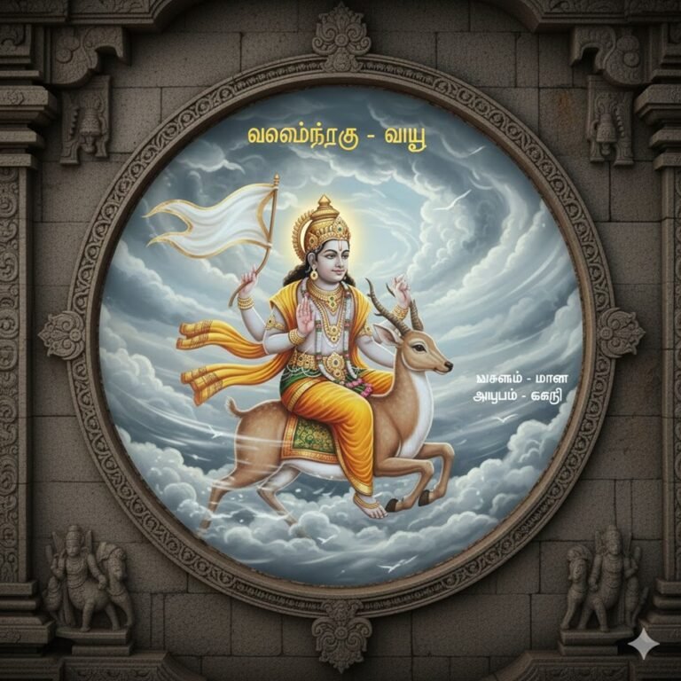 தலைப்பு விளக்கம்திசை வடமேற்கு (North-West)திசைக் கடவுள் வாயுவாகனம் மாலை மான் (Antelope/Deer)ஆயுதம் கொடி / புஷ்பக வாகனம் (Flag / Heavenly Chariot)சிறப்பு காற்று, சுவாசம், பிராண சக்தி, வேகம், ஆரோக்கியம், நீண்ட ஆயுள்,...